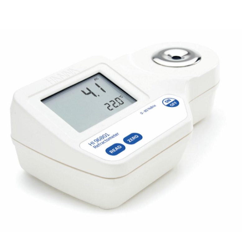 HI96801 taşınabilir refraktometre, bir gıda örneğinin kırılma indisini % brix'e dönüştürür. Bu dönüştürme, ICUMSA Yöntemler Kitabında (Uluslararası Tekdüzen Şeker Analizi Yöntemleri Komisyonu) bulunan ve ağırlıkça sukroz çözeltisinin yüzdesi için sıcaklıkla kırılma indisindeki değişiklikleri belgeleyen tablolara dayanmaktadır. HI96801, meyveler, enerji içecekleri, pudingler, soya sütü, meyve suları, reçel, marmelat, bal, çorbalar, jöle, tofu ve çeşnilerin analizi için idealdir. HI96801, tarlada veya laboratuvarda gıda numunelerindeki şekeri ölçmek için kullanımı kolay bir araçtır.