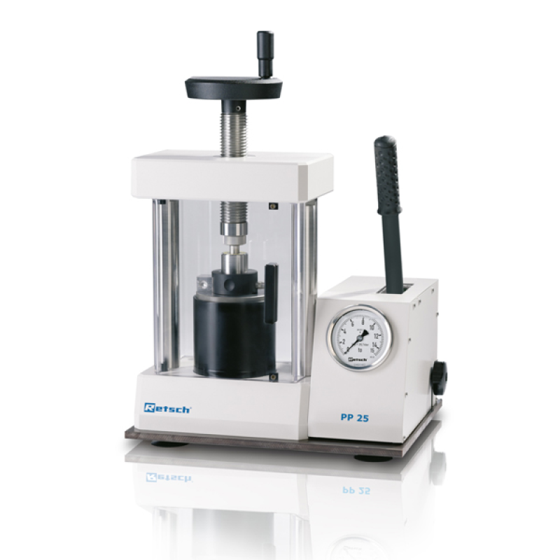 PP25, tezgah üstü kullanımıyla güvenli ve kolay çalıştırılabilen bir cihazdır.25 tonluk kuvvet ile XRF analizleri için katı numuneleri tablet haline getirir.