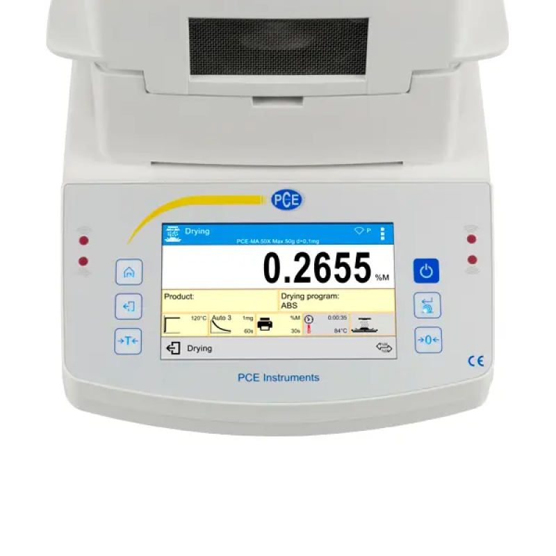 PCE-MA 50X, yüksek hassasiyetin yanı sıra başka özellikler de taşır. Numune haznesinin açılıp kapanması için temas gerekmez, tamamen otomatiktir. Bu da ölçüm hatalarını azaltır ve hijyenik, rahat ve güvenli bir çalışma sağlar. 5 inç dokunmatik renkli ekran, farklı dillerde sezgisel kullanım sağlar. Cihazın kullanıcıların, ürünlerin, müşterilerin, kurutma parametrelerinin ve 5000’e kadar kurutma analizinin kaydedilebileceği çeşitli veritabanı bulunur. Bu nedenle, malzeme numunelerinin detaylı belgelemesi hızlı ve kolay bir şekilde oluşturulur. Kurutma işlemlerinin adaptasyonu, farklı malzemelerin gereksinimlerine ayrı ayrı ayarlanabilir.