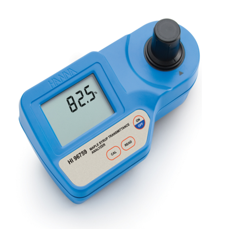 HI96759, 560 nm dalga boyunu izole etmek için dar bantlı bir girişim filtresine sahip bir tungsten lambasına sahip, elde taşınabilir bir akçaağaç şurubu geçirgenlik analizörüdür. Bu fotometre, 10 mm'lik bir numune küveti kullanır ve bir gliserol standardı ile %100 geçirgenliğe kalibre edilmiştir. Tüm numuneler gliserol standardı ile karşılaştırılır ve okumalar % geçirgenlik olarak görüntülenir. Gelişmiş optik sistemi ile son derece hassas ölçüm cihazı, doğru ve tekrarlanabilir okumalar sağlamak için öznelliği ortadan kaldırır.
