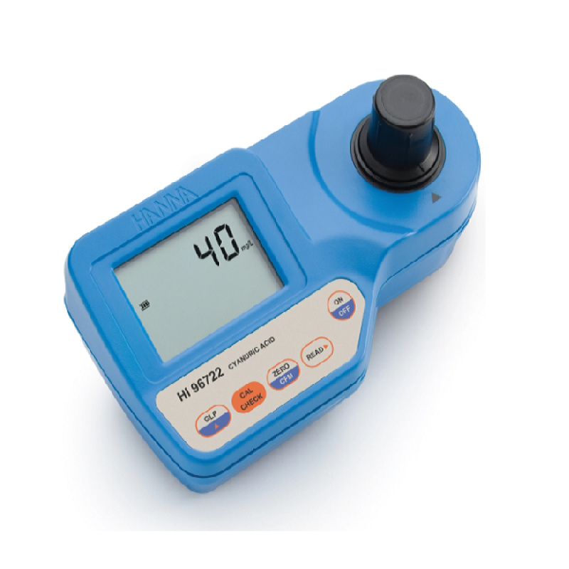 HI96722 Siyanürik Asit Fotometre, ergonomik, taşınabilir bir tasarımda doğruluk ve kullanım kolaylığını birleştirir. HI93722-0 hazır reaktifleri kullanarak kullanıcı, 0 ila 80 mg/L (ppm) aralığında numunelerdeki siyanürik asit konsantrasyonunu doğru bir şekilde belirleyebilir. HI96722, ölçüm cihazının performans doğrulaması ve kalibrasyonu için kullanılan özel CAL Check™ işlevi dahil olmak üzere birçok gelişmiş özellik sunar.