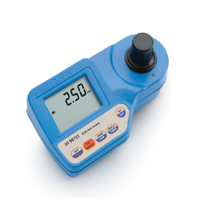 HI96721 Demir Yüksek Menzilli Fotometre, ergonomik, taşınabilir bir tasarımda doğruluk ve kullanım kolaylığını birleştirir. Kullanıcı, HI93721-0 hazır reaktifleri kullanarak tatlı su numunelerindeki demir konsantrasyonunu 0,00 ila 5,00 mg/L (ppm) aralığında doğru bir şekilde belirleyebilir. HI96721, ölçüm cihazının performans doğrulaması ve kalibrasyonu için kullanılan özel CAL Check™ işlevi dahil olmak üzere birçok gelişmiş özellik sunar.