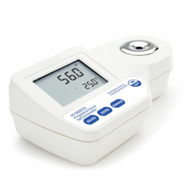 HI96832 Dijital Refraktometre, propilen glikol bazlı çözeltilerin yüzde hacmini ve donma noktalarını belirlemek için kırılma indeksi ölçümünü kullanır. Propilen glikol, bira ve şarap gibi gıda uygulamalarına yönelik glikol soğutucularda ve dağıtım sistemlerinde kullanılır. Glikolün uygun yüzdesinin korunması, glikol soğutucularda önemlidir, çünkü çok düşük bir yüzde, sistemin donmasına ve bozulmasına neden olurken, çok fazla glikol sistem verimliliğini düşürür. Cihaz, bir numunenin kırılma indisini yüzde hacim veya donma noktasına dönüştürür. Bu dönüştürmeler, glikol çözeltileri için birim dönüştürme ve sıcaklık telafisi için uluslararası kabul görmüş referanslara dayanmaktadır (örneğin, CRC Kimya ve Fizik El Kitabı, 87. Baskı).