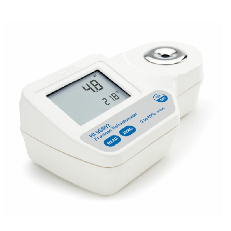HI96802 Dijital Fruktoz Refraktometre, bir gıda örneğinin kırılma indeksini ağırlıkça % fruktoza dönüştürür. Bu dönüştürme, ağırlıkça yüzde fruktoz çözeltisi için sıcaklıkla kırılma indeksindeki değişiklikleri belgeleyen ICUMSA Yöntemler Kitabında (Uluslararası Tekdüzen Şeker Analizi Yöntemleri Komisyonu) bulunan tablolara dayanmaktadır. HI96802, meyveler, enerji içecekleri, pudingler, soya sütü, meyve suları, reçel, marmelat, bal, çorbalar, jöle, tofu ve çeşnilerin analizi için idealdir. HI96802, tarlada veya laboratuvarda gıda numunelerindeki şekeri ölçmek için kullanımı kolay bir araçtır.