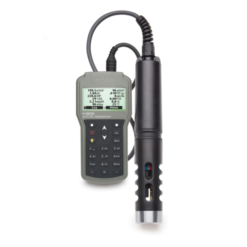HI98194, 12'ye kadar farklı parametreyi izleyen, su geçirmez, taşınabilir bir günlük çok parametreli su kalitesi ölçerdir. Çoklu sensör probu, pH, ORP, iletkenlik, çözünmüş oksijen ve sıcaklık gibi temel parametrelerin ölçülmesine olanak tanır. Çok parametreli probu, okumaları dijital olarak ölçüm cihazına iletir, burada veri noktaları görüntülenebilir ve kaydedilebilir. Komple su kalitesi ölçerin kurulumu kolaydır.