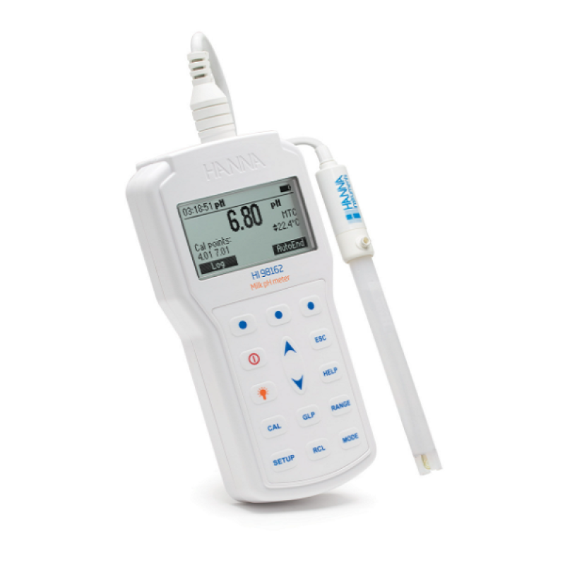 HI98162, süt ürünleri için özel FC1013 probunu kullanarak pH ve sıcaklığı ölçen dayanıklı, su geçirmez, Foodcare taşınabilir bir pH ölçerdir. Bu profesyonel, su geçirmez ölçüm cihazı IP67 standartlarına uygundur. HI98162, sayaçları, probları ve kalibrasyon tamponlarını güvenli bir şekilde yerinde tutan dayanıklı, ısıyla şekillendirilmiş bir taşıma çantasına paketlenmiş bir pH/sıcaklık ölçümü gerçekleştirmek için gerekli tüm aksesuarlarla birlikte verilir.