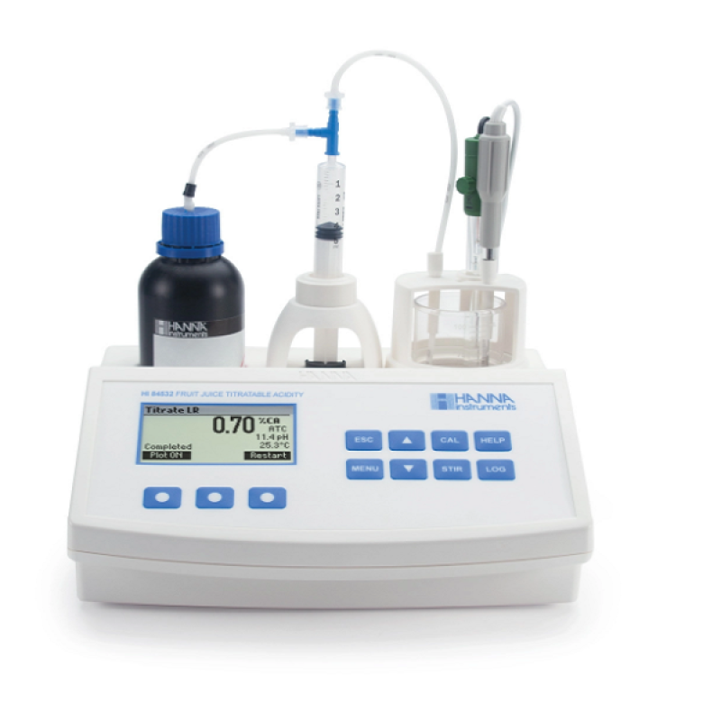 HI84532U-01, meyve suyunda pH ve titre edilebilir asitliğin belirlenmesi için tasarlanmış basit, hızlı ve doğru bir otomatik mini titratördür.