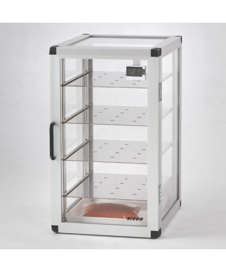 Paslanmaz çelikten yapılmış dört raf, tepsi, higrometre ve kurutucu dahil, ısıya dayanıklı borosilikat cam 3.3'ten yapılmış panellere sahip alüminyum çerçeve, 26'ya kadar rafla kullanılabilir, istiflenebilir.
