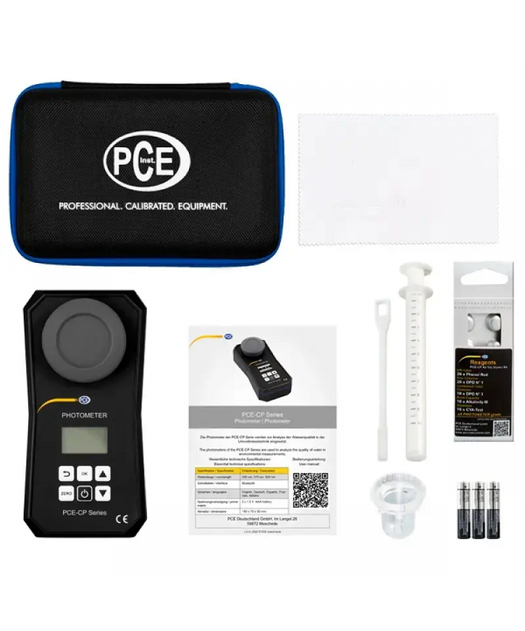 *Teslimat Bilgisi; pH Metre  PCE-CP 30 küvet dahil, Yedek Küvet, Işık Koruma Kapağı, Mikrofiber Bez, Piston, 10 ml Dozaj Pipeti, AA Pil, Hızlı Başlangıç Kılavuzu, Servis Çantası, Ücretsiz Uygulama, Ücretsiz PC Yazılımı, Ücretsiz Bulut Hizmeti, Reaktif Başlangıç Kiti (20x pH, 20x Serbest Klor, 10x Bağlı / Toplam Klor, 10x Alkalinite, 10x Siyanürik Asit) ile birlikte sunulur.