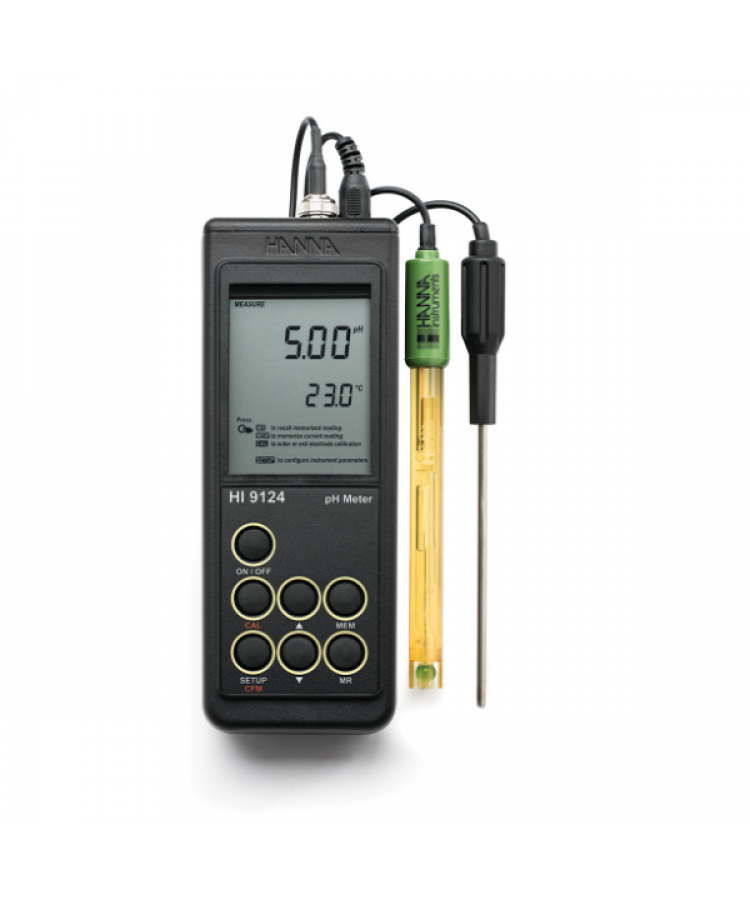 HI9124, sağlam, su geçirmez, taşınabilir bir pH metredir. Bu sayaç, otomatik kalibrasyon, otomatik kapanma, pil hatası önleme sistemi, ekran talimatları ve otomatik sıcaklık telafisi gibi birçok özellik sunar. HI9124, metre, PEI plastik gövdeli çift bağlantılı pH elektrodu ve dayanıklı bir plastik taşıma çantası içinde paketlenmiş sıcaklık probu ile birlikte verilir.