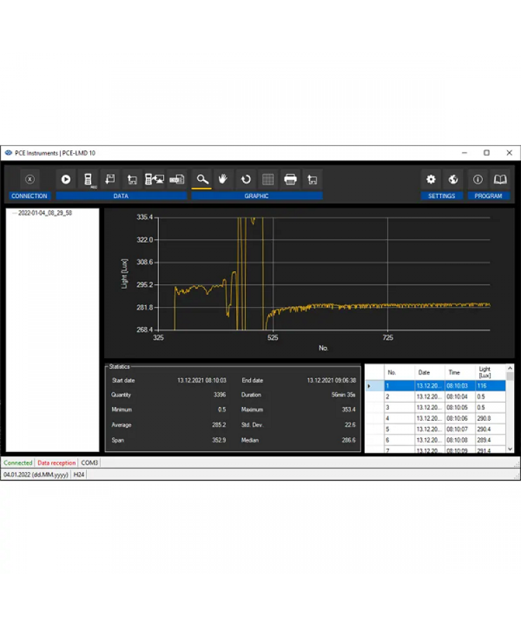 PCE-LMD 10, 32.000 ölçüm değeri kaydı imkanı sunar. Ölçüm değerleri, ölçümden sonra bilgisayarda okunabilir ve analiz edilebilir. Bilgisayarda canlı ölçüm de mümkündür. Veriler, CSV formatında dışarı aktarılarak daha fazla işlenebilir.