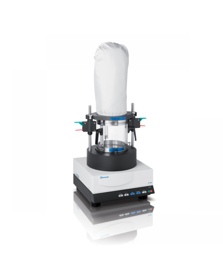 Hava akımı kapaktaki filtre torbası ile parçacıklarda oluşan nem'i ayıklar. Çapı 100 mikron daha ince ürünleri için, polar filtre ekleme ile hızlı kelepçe kapağı kullanımı tavsiye edilir. 1000 watt’lık fan,185 m3 hava akımı sağlar. Hava akımı, ısıtma gücü ve sıcaklık sürekli olarak dijital ayarlanabilir.