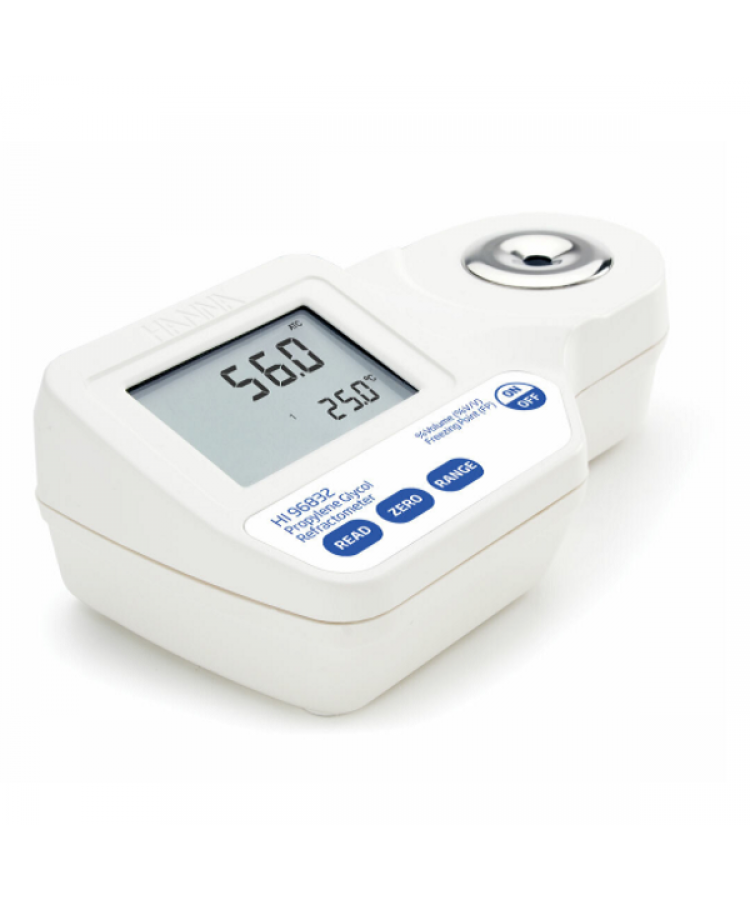 HI96832 Dijital Refraktometre, propilen glikol bazlı çözeltilerin yüzde hacmini ve donma noktalarını belirlemek için kırılma indeksi ölçümünü kullanır. Propilen glikol, bira ve şarap gibi gıda uygulamalarına yönelik glikol soğutucularda ve dağıtım sistemlerinde kullanılır. Glikolün uygun yüzdesinin korunması, glikol soğutucularda önemlidir, çünkü çok düşük bir yüzde, sistemin donmasına ve bozulmasına neden olurken, çok fazla glikol sistem verimliliğini düşürür. Cihaz, bir numunenin kırılma indisini yüzde hacim veya donma noktasına dönüştürür. Bu dönüştürmeler, glikol çözeltileri için birim dönüştürme ve sıcaklık telafisi için uluslararası kabul görmüş referanslara dayanmaktadır (örneğin, CRC Kimya ve Fizik El Kitabı, 87. Baskı).