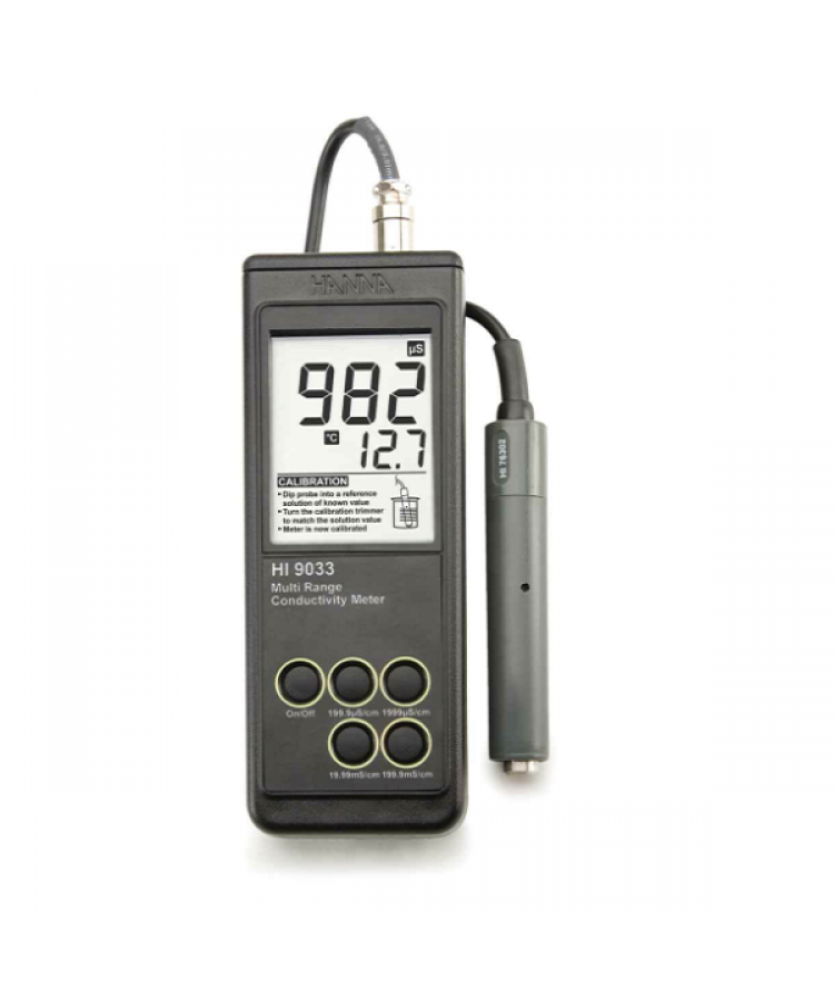 HI9033, çok çeşitli çevre koşullarında kullanım için tasarlanmış sağlam, taşınabilir bir EC metredir. Dört aralıkta ölçüm yapabilen dört halkalı bir iletkenlik probu ile birlikte verilir. İletkenlik okumaları, Otomatik Sıcaklık Telafisi (ATC) ile ayarlanır ve kullanıcılara tutarlı ve doğru iletkenlik ölçümleri sağlar.