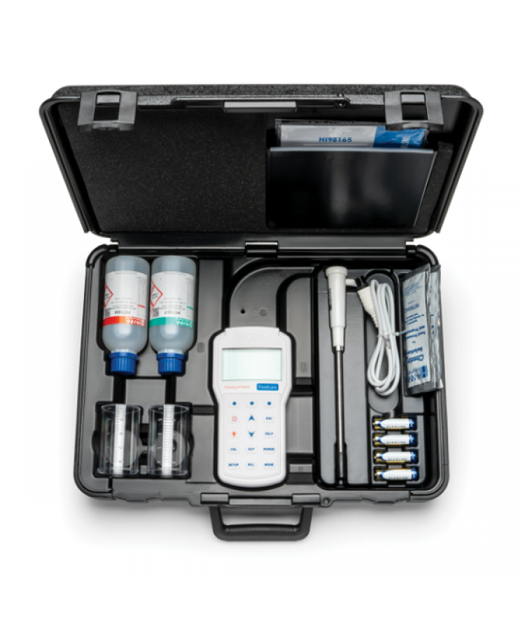 - Sipariş Bilgileri HI98165, FC2423 PVDF gövde pH elektrodu, HI7004M pH 4.01 tampon solüsyonu (230 mL), HI7007M pH 7.01 tampon solüsyonu (230 mL), peynir kalıntıları için HI700642 elektrot temizleme solüsyonu (2), 100 mL plastik beher (2), 1,5V AA piller (4), HI92000 PC yazılımı, HI920015 mikro USB kablosu, hızlı başlangıç kılavuzlu kullanım kılavuzu, cihaz kalite sertifikası ve HI720165 sert taşıma çantası.